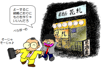 | 普通の工場ならごく当たり前に、生産管理というような部署があって、 名前の通りの仕事が行われています。 生産管理ってどういう仕事なんでしょう? ということで、市販されているテキストや参考書を開くと、 発注方式とか在庫管理とかなにやら高級そうな理論や難しい計算式が こまごまと書かれてあります。 そこで、もう一度自分の工場に帰って、 生産管理担当者の仕事っぷりを見ていると、 大声で受話器の先の営業マンや外注さんとやり取りしていたり、 ![]() 現場を駆けずり回っているばかりです。 どうもそんな高級なことが 行われているようには見えません。 |