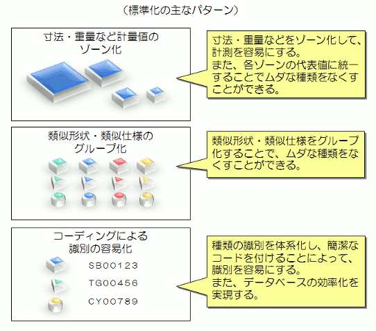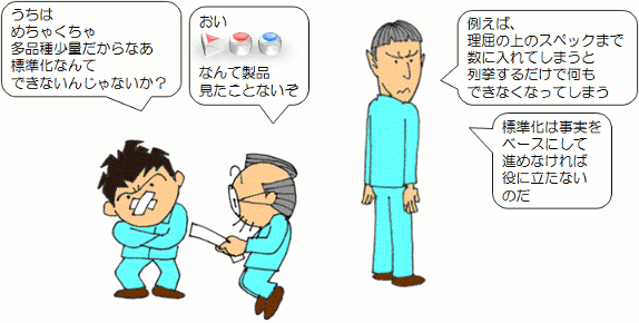 一方、 製品設計の段階で標準の重要性が認識され、 設計基準の整備が徹底されていれば、 上のような面倒な標準化活動をせずに済みます。 少なくとも、 製品や部品のタイプ化・ユニット化を進めて、 それらを編集するだけで多様なニーズに応えられるような設計を心掛けるべきです。 |