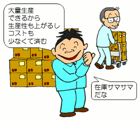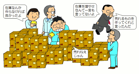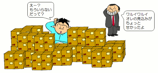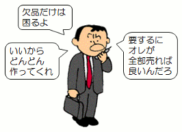 作る側も、 営業さんが欲しがる在庫を どんどん作る方が簡単です。 あとは営業に 頑張って売ってもらうだけですから こんなに楽なことはありません。 |