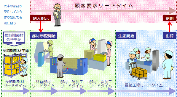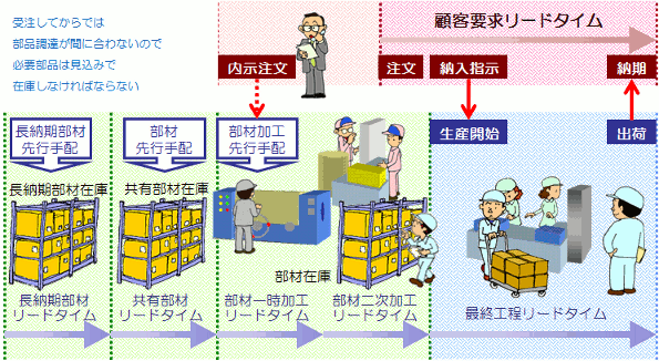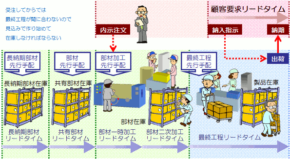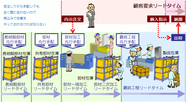 (4)顧客要求リードタイム < 最終工程リードタイム 生産が間に合わない場合は、内示注文をもらって先行手配し製品在庫を持ちます。 |