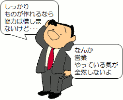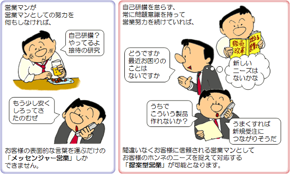 これらは、街の書店に並ぶ多くのビジネス書で、 いくらでも参考になる知識を手に入れることができます。 一方で、 販売の現場は顧客とのコミュニケーションですから、 セールススキルと共に、営業マン自身の個性や人間的魅力によるところが 非常に大きくなります。 販売関係の参考書に精神論的な内容のものが多いのはこのためです。 さまざまな流儀があり、沢山の成功事例が紹介されています。 営業マンがこれらを参考に自己研鑚することも大切なことです。 |