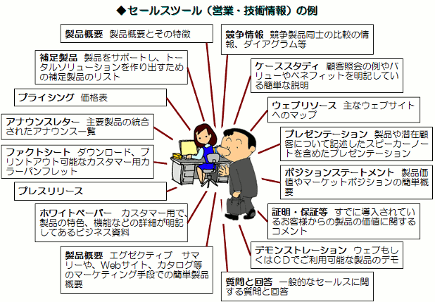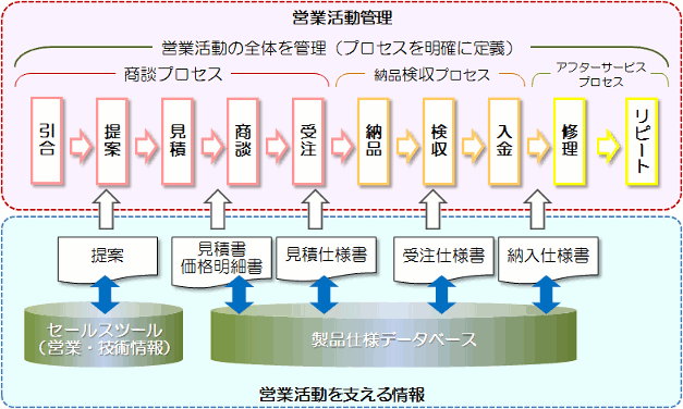 業種や取扱商品によっては、この例と異なります。 それぞれの会社できちんと整理しておくことが必要です。 (2)提案型営業への支援 提案営業に使える「営業・技術情報」を ツールとして整備して提供できるようにすることが必要です。 また、これらのツールを使いこなすために、 必要に応じて、営業マンやサービスマンへの教育も実施するようにします。 |