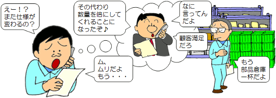 頻繁な注文変更が常態化して、工場の対応が全く追い付かず、 在庫も増大するばかりになっている。 |