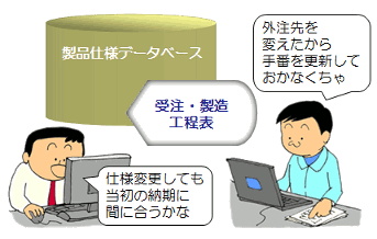 注文が短納期となる大きな原因に仕様・数量・納期の変更があります。 営業がお客様の要求を工場に伝えるだけのメッセンジャー営業だと、 工場の生産状況はおろか、在庫も確認しないで注文を受けてしまいます。 その結果、大きなトラブルになってお客様にも工場にも迷惑をかけることになります。 4.4で営業マンの質の向上について触れたのは、こういう意味なのです。 変更依頼を受ける際は十分に注意しなければなりません。 営業があらかじめ、工場の生産状況を把握していれば別の対応も可能となるでしょう。 営業プロセスと製品仕様データベースを整備しておけば、 例えば、下のような受注・製造工程表が作成できます。 製品仕様データベースには、機種別・仕様別の標準納期が登録されていますから、 これを利用して、仕様決定・変更の時期を明確にするのです。 営業はこの表を参照して、どの時点でどこまで変更が可能かを念頭に受注対応します。 |
