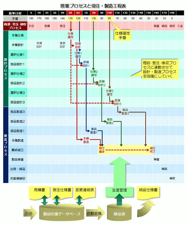 営業は随時この表をチェックして、 製造に混乱を起こす確定遅れやムリな注文変更に歯止めをかけます。 ![]() この表は営業・工場の双方が管理して、 常に最新の情報に基づいた状態にします。 また、他部門も参照できるようにします。 下は、機種ごとに標準工期を設定し、 機種ごとの手番と連動して商談を進めていく受注生産の例です。 営業は商談情報を工場に送って、連絡を密に取り合い、 顧客ニーズにムリなく応えられるように商談を進めていきます。 |