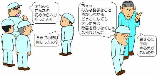 改善の目的が見えていないと、 今までと異なる局面に入った途端にやるべきことがわからなくなって、 日常業務の中に埋没してしまう。 それ以降何の進展もなく、だんだん改善活動そのものが胡散臭いものに見えてくる。 こうして一番まずいパターンに入っていくわけです。 |