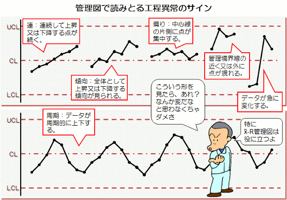 目の前の工程がどんなに良好な状態にあっても、いつ異常が現れるかわかりません。 問題が発生してしまったら、もう欠品や納期遅れは避けられません。 事前にそれを察知して、ロスにならないように予防措置をとることが管理なのです。 例えば、管理図はこのような管理のツールとして大変便利で効果的なものですが、 問題ないから意味がないと思っているのか、それとも作るのが面倒なのか QCの他の手法に比べると、あまり活用されている例を見ません。 |