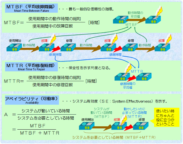 また、機械の予防保全を行うために、 MTBF(平均故障期間)やアベイラビリティ(availability:可動率)といった 指標を把握しておけば、定期点検やメインテナンスのサイクルを設定できます。 さらに機械の信頼性を高めるための改善指標にもなります。 |