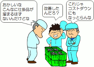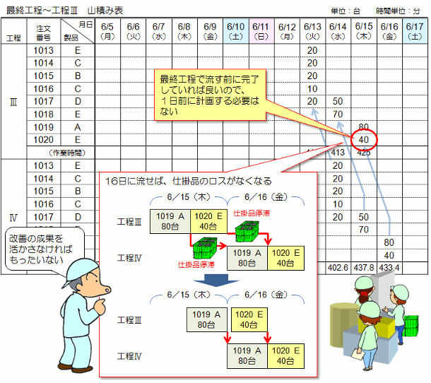 改善で管理工程間の能力バラツキを解消していますから、 どの工程も極端な能力不足や能力余剰になることはありません。 すんなりと平準生産できます。 ま、これで十分間に合うと言うなら、それでも良いのですが・・・ ![]() 前に、 仕掛品の滞留を見つけたら問題ありと思え と言いました。 上のような計画の立て方をすると、 最終ロット40台(注文番号1020)は、 前日15日に工程Vを済ませていますから、 最終工程にかかる16日の午前中ずっと 仕掛品のまま滞留状態です。 これ、もったいないですよね。 今までリードタイムを短縮するために、現場が改善を繰り返してきたのに その成果が全く活かされていません。 要するに、最終工程が始まるまでに工程Vを終わらせれば良いのですから、 わざわざ前日に作って仕掛品にしておく必要はありません。 |
