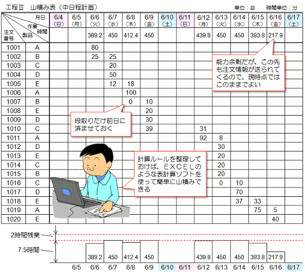 能力をオーバーした分だけを前日に回せば、 生産リードタイムが圧縮されて短納期に対応しやすくなります。 このように後ろに詰めて計画を立てれば、 管理工程間に余計な仕掛品を溜めることはなくなります。 こういう計算は、算盤や電卓しかなかった時代は非常に面倒で大変だったため、 簡易的に手番を管理工程の数に置き換えていた面もあります。 でも、今はITの時代です。 計算ルールを整理してきちんと標準化しておけば、 EXCELのような誰でも使えるソフトを利用して簡単に計算ができます。 自動計算した結果を基にして、あとは手入力で調整すると良いでしょう。 |