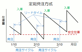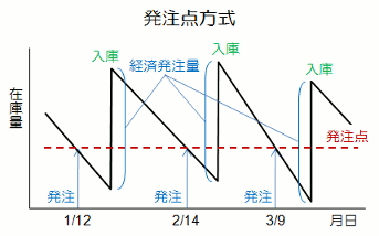 | これに対し、部品・材料の場合は、生産指示により必要な分だけ出庫されるので、 まとまった量が不定期に消費されます。 このようなタイプの需要に定期発注方式や発注点方式を適用すると、 安全在庫をどんなに高く設定しても品切れになる危険があります。 |