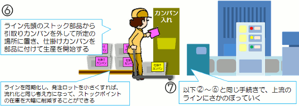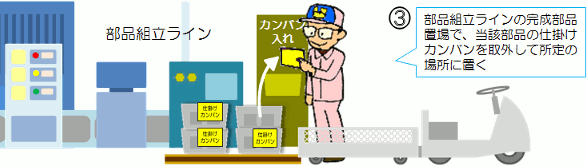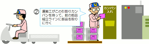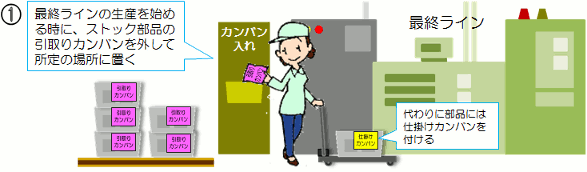 | ジャストインタイムと言えば、忘れてはならないダイナミックな方式があります。 1970〜80年代に一世を風靡したカンバン方式です。 簡単にやり方を説明すると・・・ |