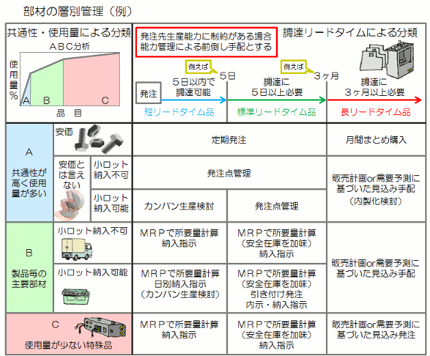 では、MRPなら問題なくジャストインタイムが実現できるかと言うと、 前節で見たように、MRPとて生産計画から部材の所要量を得る計算ツールに過ぎません。 確かに、元のデータが確定注文ならMRPで正しい部材手配が可能になります。 しかし、生産計画の中に未確定の注文が混ざっているという事実は変わりません。 これを十把一絡げに手配するのは現実的とは言えません。 実際には、部材によってカンバンが合っているものもあれば、 MRPで発注する方が良いものもあります。 そこで、部材の特性を調査して、それぞれに適した手配ができないかを考えます。 例えば、次のような切り口で層別し、手配方針を決めていきます。 |