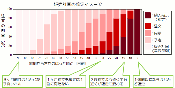| 発注の手間を削減するためにまとめて発注し、 あとは日々納期管理・・・といった部材手配をする会社をよく見ます。 例えば、月間生産計画が出された時点で所要量を計算して発注するというやり方です。 1ヶ月分をまとめるので、その内容はほとんどが確定していない注文です。 手配の元になる販売計画の注文データがどのように確定に変わっていくか? そのイメージを図にすると、下のようになります。 |