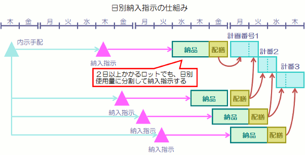 この例ですと、調達リードタイムが15日で確定は4割程度です。 残りが未確定ですが、予定・予測レベルと違って確度はかなり高い注文になっていますから MRP計算で、安全在庫を加味した所要量を発注します。 (2)内示発注と納入指示 混同するといけませんから、計画データの内示・注文は未確定注文と呼ぶことにしましょう。 引き付け発注をすべて確定としてそのまま納入してもらうのでなく、 未確定注文の分を内示として手配し、後で納入指示をするやり方です。 |