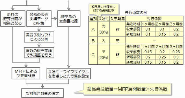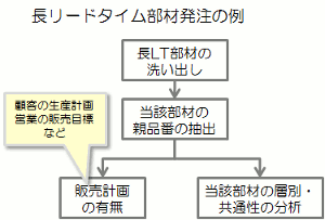 これは、長リードタイム部材の 共通性やライフサイクルを考慮した 先行係数を用いた事例です。 販売計画または 需要予測ソフトで分析した所要量に 先行係数を加味することで 内容に応じた発注数量を決めます。 |
