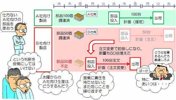 ![]() 予測は必ず誤差を伴います。 誤差がある限り、在庫リスクを免れることはできません。 予測誤差を小さくするためには K・K・Dに頼るのでなく、 合理的な手段で計画の精度を高めなければなりません。 また、在庫リスクの責任を明確にしておくことも必要です。 (4)部材のひも付き管理 手配する部材は顧客別のひも付きにします。 注文変更によって部材の必要量が変化した場合、安易に在庫の使い回しをするのではなく 注文の優先順位に従ったひもの付け替えをします。 また、長リードタイム品や専用部材は、責任を明確にして安定確保を図ります。 |