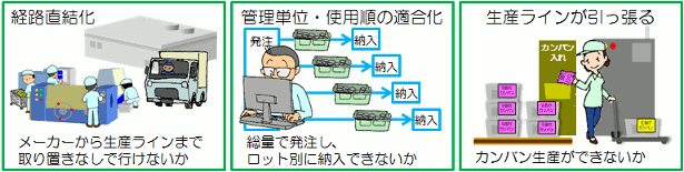 足元をいい加減にしておいて、発注先にムリを押しつけることはできません。 上に示すような課題のクリアはもちろんですが、 システム構築・運用に不可欠なルールを整備しておくことも怠ってはいけません。 例えば、長・短リードタイム品の定義や、計画の優先順位、 注文のひも付きルールなどを明確にしておきます。 (2)他社方式の研究・活用 ![]() サプライチェーン構築については、他社の例も参考にしましょう。 もちろん、直接指導を受けることは困難と思いますが、 システムのベンダー(販売会社)や、物流関連機器の代理店から、 商品の導入事例など具体的な情報が手に入ることも少なくありません。 (3)部材メーカー・生産ライン直結化 社外サプライチェーン作りです。例えば、次のような課題を検討します |