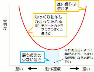 機械時間は計算で求められますが、人作業の場合は実際に行われる作業を計測して決めます。 ただし、意図的に身体の動きを速くしたり遅くした時間を標準時間としてはいけません。 人の動作速度と生理的な疲労は右のような関係があり、 最も疲労の少ない速度で行った時間を 標準時間とします。 つまり、標準時間は作業者に関係なく 作業方法で決まる時間であって 作業方法が変更されれば 標準時間も改訂されなければいけません。 これ大事なポイントですからお忘れなく。 一方、生産能力枠は、負荷・能力管理が実施されていれば自ずと設定されます。 具体的には次のように計算します。 |
