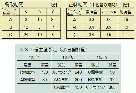 小日程計画は、その日の生産予定ロットをいつ投入していつ完了するか、 標準時間と生産能力枠の数値を使用して計算したシミュレーションです。 したがって、作業条件が計算と実際とで差異があってはいけません。 |