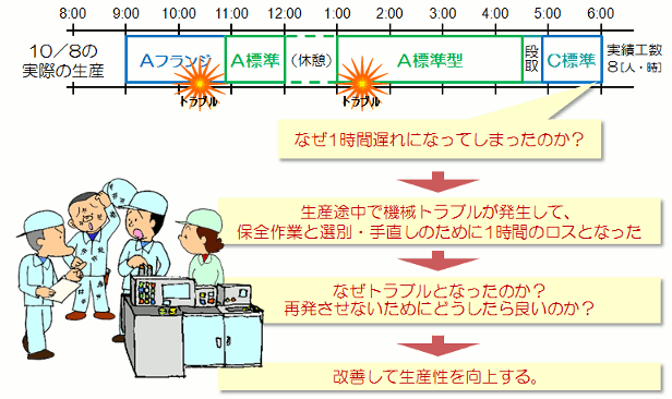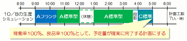 このようなシミュレーションに対して、実際の生産は1時間遅れになっていました。 ここからが小日程管理の重要なプロセスです。 |