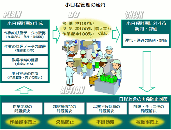 | 小日程管理は目標管理・進捗管理と連動して改善活動に直結する仕組みです。 この点に着目して、活動規模が大きくなる生産管理改革とは切り離し、 生産拠点・工場ごとに小日程管理だけを実施することがよくあります。 |