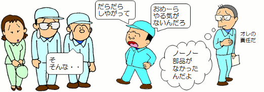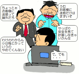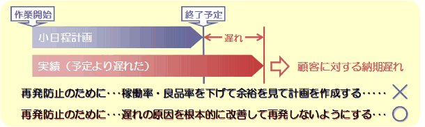 (3)実績に基準を合わせてしまう例えば、実際の時間が予定よりも遅れて、 それが納期遅れとなって お客様に迷惑を掛けてしまった場合・・・ お客様第一は良いのですが、 これでは問題を見えなくしただけで、 本当の再発防止にはなっていません。 そのまま何の手も打たず、 いつまでも欠陥を抱えたままだと いつかまた迷惑を掛けることになります。 |
