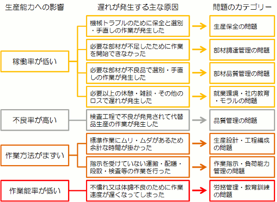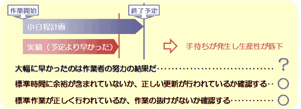 作業能率を考える前に、 作業中にロスはなかったか?作業のやり方は今のままで良いか? を考えるべきです。 このことを作業者とも話し合い、よく理解してから小日程管理を実施しないと、 労働強化と誤解されかねません。 遅れる原因を考えてみると・・・ |
