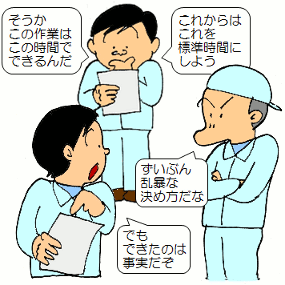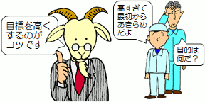 この目的の説明をなおざりにして 「とにかく目標値は高めに設定しておけ」 という指示をする人がいます。 根拠の見えない目標設定は 作業者に不信感を持たれてうまくいきません。 |