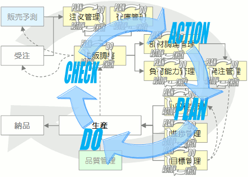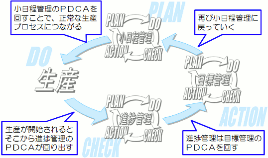 このように考えると、 小日程管理をひとつのプロセスにした大きなPDCAが見えてくるでしょう。 その小日程管理の前には、部材調達管理や負荷能力管理のPDCAが、 さらにその前には、注文管理や在庫管理のPDCAが回って 生産管理の大きなPDCAを回しています。 |