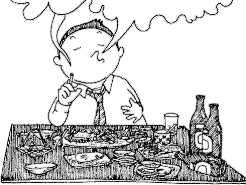 | SANKAINO CHINMINI HARANO MICHITARITE NANIHANAKUTOMO SHOKUGO NO IPPUKU Being full with all sorts of delicacies, nothing is more important than smoking after the meal. |