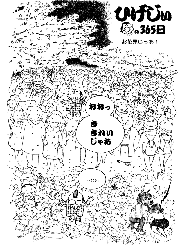 桜、桜、どこもかしこも薄いピンクの華やかさ。みんな染井吉野という同じDNAのクローンなのに、よく見ると一株一株で個性にバラツキがあるのが自然界の不思議で面白いところ。このマンガは5年前の4月の作だから、確かに今年は開花が早いんだな。温暖化?そうかもね。→ひげじいは 午後の絵本 に収録しました。 |