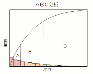 管理すべき対象製品の品目が多い場合に、その数量(生産量・出荷量等)に応じてメリハリのある生産管理・資材管理を行おうとするもの。 PQ分析の上位10%の品目をAグループ、次の20%の品目をBグループとし、残りをCグループとする。Aグループで全体の60〜70%の数量を占め、さらにBグループまで含めれば90%を占めるというような傾向が見られる場合、少ない品目を重点的に管理することで、効率的な管理ができる。このような管理方法をABC管理と呼ぶ。さらに細かくDグ ループ、Eグループ・・・と分けることもある。PQ分析に累積度数を表示させたグラフをABC分析という。考え方はパレート図と同じである。 |