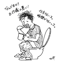 | 今朝の行動と言っても、ただ遅刻をしないように必死になっていただけで別にいつもと変わったことをしたわけでゃない。 「なんというかその、普段は朝起きてから家を出るまでどれくらいかかっているのかな?」 出勤前の行動というのは、誰でも似たりよったりのものだ。まず、起床して床上げに5分、洗面5分、食事10分、用便5分、着替えに5分、これに新聞を読んだりテレビを見たりなどの雑用が10分加わって40分・・・と、まあこんな感じのところではないか。「ところで、今朝は何分かかったんだ?」 「いやあ、今朝は驚異的な速さでしたよ。なんと、半分の20分!生産性2倍向上なぁんちゃって・・・へへへ」 「そこがポイントだ。なんというか、いつもと同じ事をやっているのにどうして半分の時間で済むんだ?」 「うーん、そりゃもう大変な努力です。着替えをしながらパンをかじって、トイレに入りながら歯を磨いて、猛スピードで玄関を走り出て・・・そうか」 上杉君、ポンと手を打って何かに気付いたふうだ。 「猛スピード、つまり動作をめちゃくちゃ速くすればいいってことか」 織田課長は処置なしというような顔をして、 「上杉、おまえ、ほんとに天候のせいでネジがゆるんでしまったみたいだなあ。めちゃくちゃ速くというのは改善じゃないぞ。改善というのは作業を楽にすることなんだ」 と言われても、今朝のどこに改善のヒントがあるのか、上杉君にはわからない。 「今朝、いつもの半分の時間で済んだのは、なんというか3つの理由があると思うんだ。 「まず、それぞれの動作がテキパキとしていたこと、次に普段やっていることを省略したこと、3番目に1つのことを別のことと同時にやっていたこと、だよね?」 小首をかしげながら、上杉君はこっくりうなずいた。 「1番目は、ほんの少しずつ動作を速くすると全体も速くなる、ということでこれはチリツモ作戦とおなじことだ。2番目は不要なことを省略する、ということでこれはナクス作戦だな。問題は3番目だ」 |