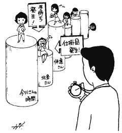 | ナガラ作戦で最も簡単なのは、両手を使うということだ。 作業をよく観察してみると、利き手と反対の手が遊んでいることが結構多い。右手を使いナガラ左手も使うことができないか?まず、これで攻めてみよう。 遊んでいるのでなく、左手が品物の保持のために止まっていることも多い。この場合は保持しなくても済むような工夫をしてみよう。 同じパターンの応用で、手と足を同時に使えないか?目と耳はどうか? 人間だけにこだわる必要はない。機械を使った作業の場合はどうだろう?機械に品物をセットした後、できあがるまでじっと待っているということはないだろうか? 機械を動かしている間、別の作業を行う。これもナガラ作戦の基本パターンである。 「あるある、ナガラ作戦はかなり効果があるぞ」 上杉君の改善提案が前にも増して出てくるようになった。 ところが。 「上杉さん、私ヒマです。何をすればいいでしょうか」 という声があったかと思うと、 「上杉さん、こんなに沢山私一人では処理できません」 ・・・これは、どういうことだ? ナガラ作戦でみんなの作業スピードが速くなってきたのは事実だ。 なるほど、北条さんの作業は次の1個が流れてくる前に終わってしまうので、いわゆる手待ちになっている。 次の工程の伊達さんも速くなってはいるのだが、前の工程ほどではないのでどうしても中間に仕掛品がたまってしまう。処理しきれないので箱に詰めて置いてある。前の北条さんの作業が速すぎるために、思いもよらないムダが大量に発生してしまった。 「上杉、これはどうしたことだ」 「あ、武田課長、すいません。改善したんですけどねぇ。おかしいな」 武田課長は上杉君の上司。製造課の課長だからラインの異常にも敏感だ。 「一体全体、どんな改善をしたんだ?」 |