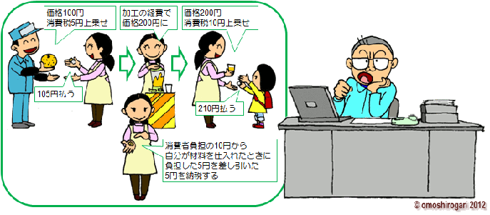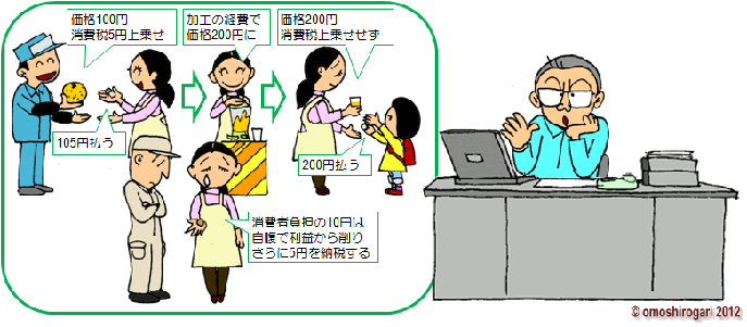 消費税の納税をするのは 企業の方なのだ 商品の価格に上乗せして 消費者に負担して もらっているだけのことだ |
