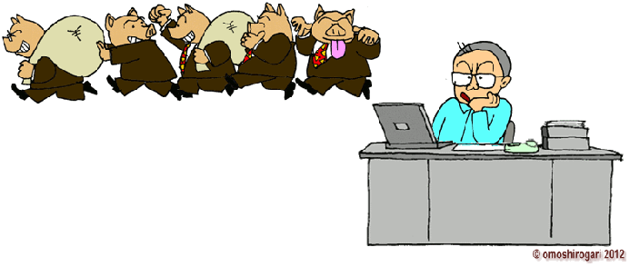 しかも彼らは 消費税を上げる代わりに 経済活性化のために 法人税を下げろと主張する そりゃ法人税が下がれば オレたちも少しは助かるけれど 隣の工場みたいに 不採算で苦しむ中小企業には 焼け石に水だ結局のところ 大きな企業だけが大もうけする という構図なのだ・・・ |