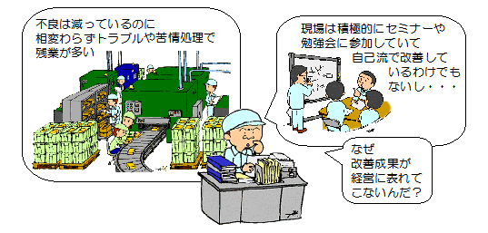| これは、比較的熱心に品質改善活動を進めている会社の例です。 現場の係長・リーダーは目標を順調にクリアしている活動に満足しています。 部下とのコミュニケーションも活発で職場内のムードは悪くありません。 にもかかわらず、課長以上の管理者の悩みは・・・ |