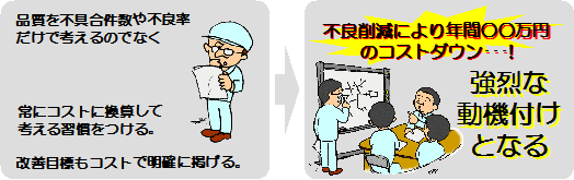 | 品質=損失(コスト)なのですから、改善の評価指標はコストでなければ、 期待する成果は得られません。 |