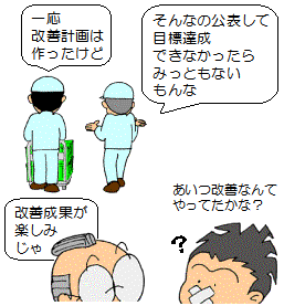 | 目標をさらけ出すというのは、プロジェクトが成果を出すために不可欠な条件の一つです。確かに、当事者にとってはものすごく大きなプレッシャーには違いありません。しかし、目標を周囲に知ってもらうことによって、逆に理解者、協力者、サポーターを得ることができます。それを利用して自己実現につなげることもできるでしょう。 ところが、何が困るのかわかりませんが、ときどき、お客様や外部業者には見られたくないといって、滅多に人が入らない会議室などにひっそり掲示して、紙の色が変わるまで放っておく会社があります。このような改善活動が満足な成果を出した例を見たことがありません。 |
