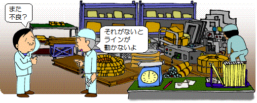 不良が出ると、さっそく相手を呼び出します。 やってくるのは汚れた作業服を着た社長さん というイメージです。 まずは不良の現品を見せて事実を確認させます。 |