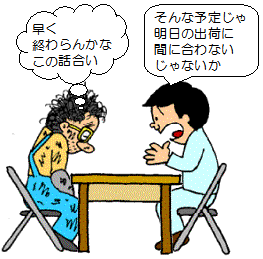 | こうなってしまうと、 社長さんの頭の中には、もはや、 この打合せが無事に終わってほしい ということだけしかありません。 |