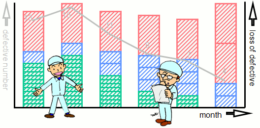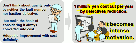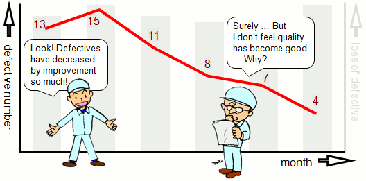 Because it’s quickly transposed to a numerical value when evaluating quality, it tries to use the number of fault or complaints.Such a company…there’re quite a lot. And most of them hold the common trouble like the example. Some companies use the number alternatively for the reason grasp of cost is not easy, but it’s impossible that the quality improvement achieves the success with an actual feeling as far as they use a number evaluation resignedly. Because quality is loss (cost), the result expected will not be obtained if the evaluation index of an improvement is not cost. |