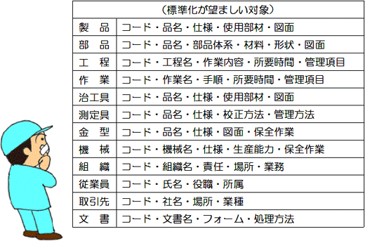 例えば、生産ラインや管理システムを立ち上げたり、オートメーション化を図るというような場合には、標準化は不可欠です。ところが、標準化は根気よく地道に進める活動ですから、どうしても結果を急いで端折りがちになります。これは間違いなく挫折しますから、胆に銘じておくこと。 公的規格や社内標準を、みなさんは普段なにげなく使っていますが、それらはすべて、たくさんの人の長期にわたる苦労の末に確立したもの、ということを忘れないでください。 |