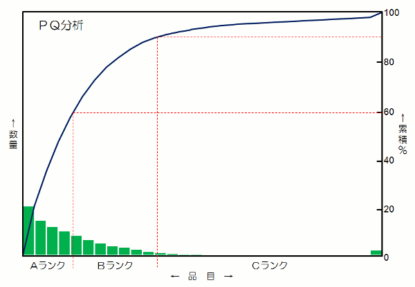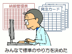 | PQ分析とは、品目(Product)を数量(Quantity)の多い順に並べたものです。考え方は品質管理のパレート図と同じですが、生産管理や工程管理ではPQ分析とかABC分析といった呼び方をします。 全体の60%と90%のところで境界を設定し、それぞれA、B、Cとランク付けを行いました。 Choose 〜選択する Aランク品はよく流れている品種で、これを標準品としてラインを整備することにします。逆にCランク品は年に1〜2回の注文しかないので特殊品としました。 中間のBランク品は、当面は特殊品扱いとしましたが、段取作業を改善すれば標準品と同じラインで流せそうでした。また、生産工程を調べれば、Cランク品の中にも標準ラインで流せる製品があるかもしれません。 これらは、次の課題として取り組むことにしました。 (2)作業の標準化 資材担当者は、生産に用いる部品・材料を取引先に発注し、納期通りに納めさせるための管理を行っています。この度、生産管理のシステム化を図るために、資材担当者が行っている作業のやり方を標準化することになりました。 ![]() Collect 〜列挙する 資材担当者は6人で、生産ライン別に担当が分かれています。それぞれ前任者からの引き継ぎで行っているため、やり方はバラバラでした。 とにかく、みんなの作業のやり方を全て出すことにしました。 Classify 〜層別する 調べてみると、Fさんだけが単票に発注データを記録するやり方で、あとの5人は一覧表を作って作業していました。 Compare 〜比較する 今まで他の担当者のやり方を知らなかったので、みんな興味津々で作業のやり方を見せ合い、それぞれ試してみて長所や欠点を調べました。 ![]() Choose 〜選択する 一番簡単で使いやすかったのがCさんの表でした。ただし、そのままでは共通に使えないので、他の表の長所を取り入れて標準としました。また、発注してから納期までの期間が長いものは、Fさんのカード方式がやりやすいと感じたので、これも標準のやり方として残すことにしました。 (3)工具の標準化 大型機械組立メーカーの例です。 部品は外作が基本ですが、精度の必要なものは社内の切削部門で作っていました。ところが、組立完成品の高性能化に伴って内作部品が多くなり、多品種少量生産に拍車がかかっていました。最近は組立に間に合わなかったり不具合品が頻繁に発生して、生産のコントロールができなくなっているというのです。 実際の作業を調査していくと、同じ部品でも作業者によって加工方法が異なり、使われている工具もバラバラでした。工場の中に様々な種類の工具が散在して混沌としていました。 とにかく、作業者の周りを整理して、見通しの良い工場にしなければなりません。 ![]() Collect 〜列挙する まず最初に「工具の棚卸し」を行いました。使用中のものから、棚や台の上はもちろん、作業者専用の棚の中まで見せてもらって、工場内にあるすべての工具を調べ尽くしたのです。 仲間と手分けして調べた工具は5000種類に及びました。丸3日かかった棚卸しも大変でしたが、ノートの記録もかすれた文字が油で汚れて、データのまとめに気が滅入ったものです。 Classify 〜層別する 次に、洗い出した工具を分類しました。 ほとんどの工具はJISの標準品が使われていましたが、治具はすべて作業者の手作りで、数もたくさん作られていました。また、難しい形状を削り出すために、刃先を変形させた異形刃具もよく使われていました。 |