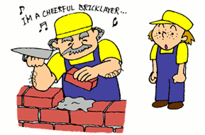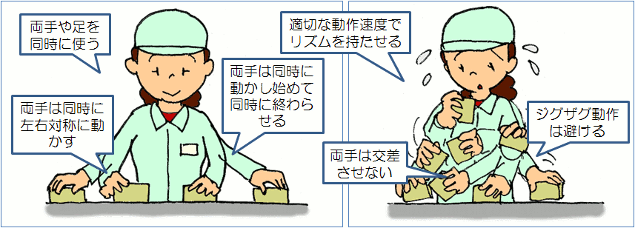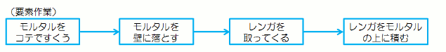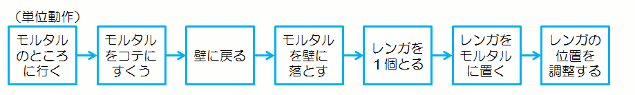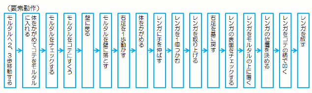 ※ギルブレス青年の着眼点は次の通り @足場を工夫して、作業動作をいつも最適な位置でできるようにした。 …最適作業域の確保 A足場に適当な高さの台を設けて、レンガとモルタルをその上に置くようにした。 …かがむ動作、2、3歩歩く動作をやめた B使用するレンガの一番きれいな面をそろえて、レンガをあらかじめ木枠に入れておくことにした。 …一つ一つレンガをチェックしなくても済むようにした Cモルタルの調合を工夫して、適正な固さに保てるようにした。 …コテの柄で叩かなくても、手で押しつければ付くようになった |