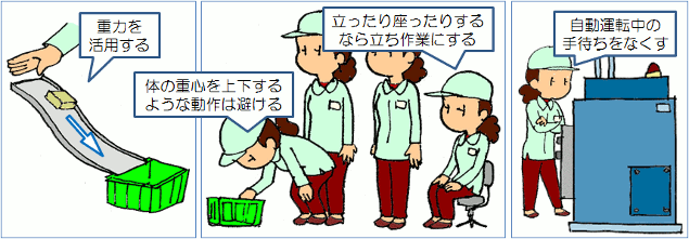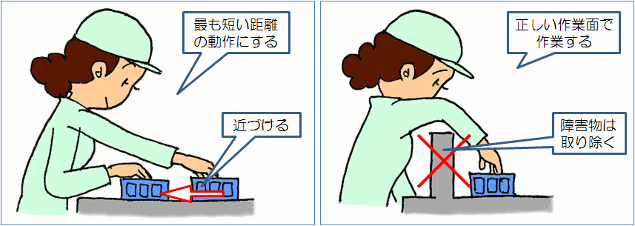 4.動作経済の原則 モーションマインドを持って改善を繰り返していくと、だんだん改善のコツのようなものが見えてきます。そのようなコツをまとめたのが動作経済の原則です。 この原則は体系的と言うより、先人たちが改善した経験から積み重ねてきた虎の巻のようなものです。文献に紹介されているものを見ても著者によって様々ですし、これから新たに加わる原則もあるかもしれません。また、動作だけでなく、レイアウトや自動化などについての原則もあります。 しかし、これらの原則を知識として覚えるだけでは、使いこなすことは難しいでしょう。みなさんが実際に改善を行って、その経験から身につけていくこと。みなさん自身が悩み、考え、体で覚えた生きた原則を持って欲しいのです。 ここではごく一般的な基本原則の一部を紹介します。 |