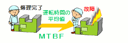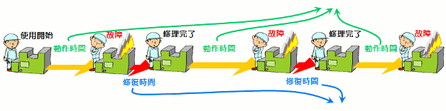 MTBF(平均故障間隔)とは機械が動いている平均の時間のことです。したがって、MTBFとMTTRからアベイラビリティを求めることができます。 |