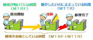 ![]() 機械が動いている時間 アベイラビリティ = ――――――――――――― 機械を必要としている時間 MTBF = ――――――――――――― MTBF + MTTR |