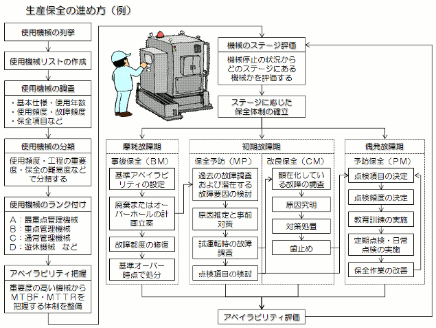 機械にタイマーをセットしておけば、MTBFとMTTRを把握するのは難しくないでしょう。 これらの指標は、生産保全における改善目標を明確にしてくれます。例えば、故障しにくい安定した機械を目指すことでMTBFが伸び、機械の保全性を高めて修理の迅速化を図ることでMTTRが短縮します。こうした改善を進めることで、アベイラビリティも向上していきます。 4.効率的な生産保全 保全を担当する人は有能で器用なエンジニアが多く、豊富な経験を活かして厄介なトラブルも解決してしまいます。ところが、実際の生産現場をのぞいてみると、相変わらずトラブルの時だけ活躍する修理工で、日常点検や定期点検は現場の作業者とその上司がやっているという工場が非常に多い。 また、現場で改善活動を進める場合でも、活動を援助するオブザーバーのような位置に甘んじて、責任のないただの便利屋になっています。 しかし、ここまでお話したように、生産保全というのは、最初は事後保全だけだったのが、予防保全を取り入れるようになり、それでも効率が悪いので、機械に応じた保全を行うようになったというものです。この保全体制を確立するのは重要な課題です。 何もしなければアベイラビリティは向上しません。アベイラビリティが低いと稼働率も低下し、大きなムダになります。保全担当者自らが改善を進めていかなければ、責任を果たしているとは言えません。 ![]() |